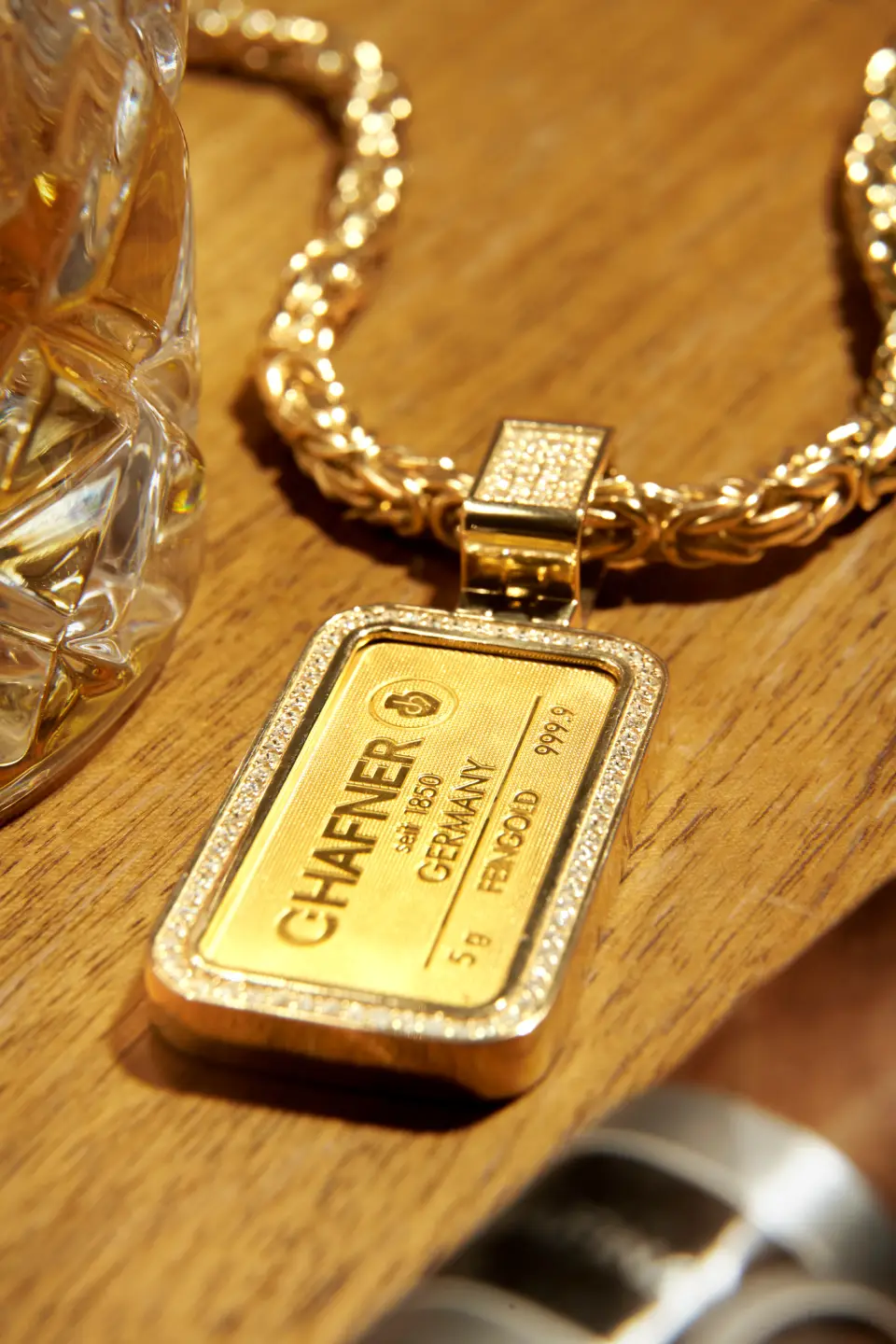 Within M&M GOLD, the workshop develops high-end jewellery techniques: hand-polishing bullion surfaces, precise diamond setting, custom engraving and designing unique chain settings. Each bullion-necklace carries an artistic signature that defines the brand.